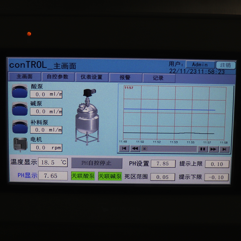 自動加料控制系統(tǒng)在線PH自動控制系統(tǒng)觸摸屏控制三臺蠕動泵的進料速度,根據(jù)設置的PH值自動補料,數(shù)據(jù)導出有USB接口,導出格式EXCEL