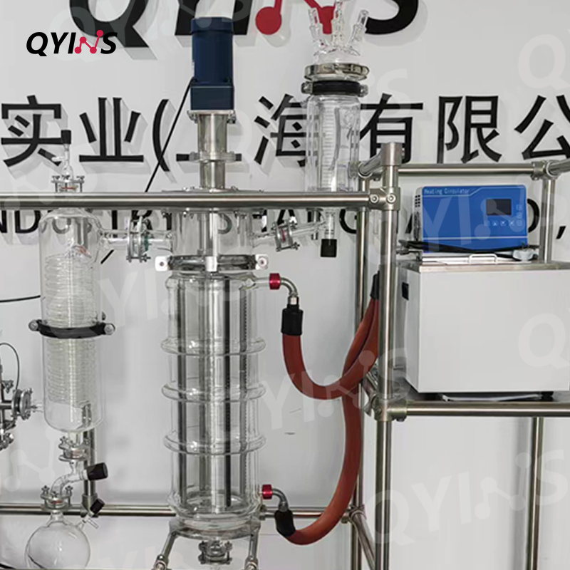 薄膜蒸發(fā)器設備:主體通常采用高硼硅玻璃等材質制成,具有良好的耐腐蝕性和耐高溫性,可很好地觀察到整個工藝的運轉過程。筒體內設有旋轉刮板或固定刮板,用于將物料在加熱面上形成薄膜,增加蒸發(fā)面積,提高蒸發(fā)效率。物料進入蒸發(fā)器后,通過刮板攪動快速成膜熱源熱量經(jīng)筒壁與料液進行加熱交換,液膜沸騰、氣化,進入冷凝器內,凝結成液體排出,濃縮液由底部出料口放出。