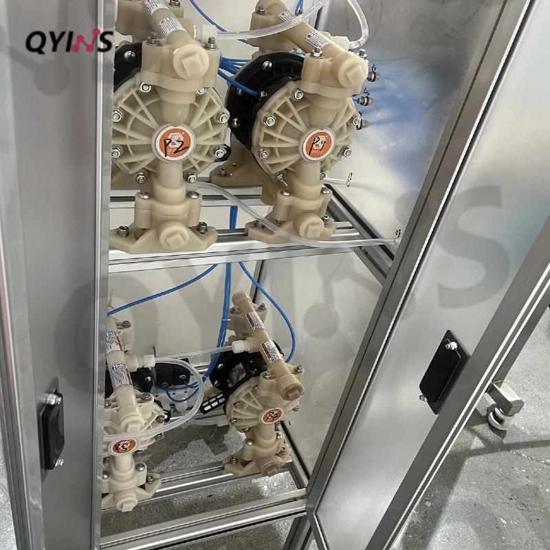 整條線采用PVDF氣動(dòng)隔膜,通過控制系統(tǒng)調(diào)節(jié),可實(shí)現(xiàn)流體半自動(dòng)進(jìn)出料。